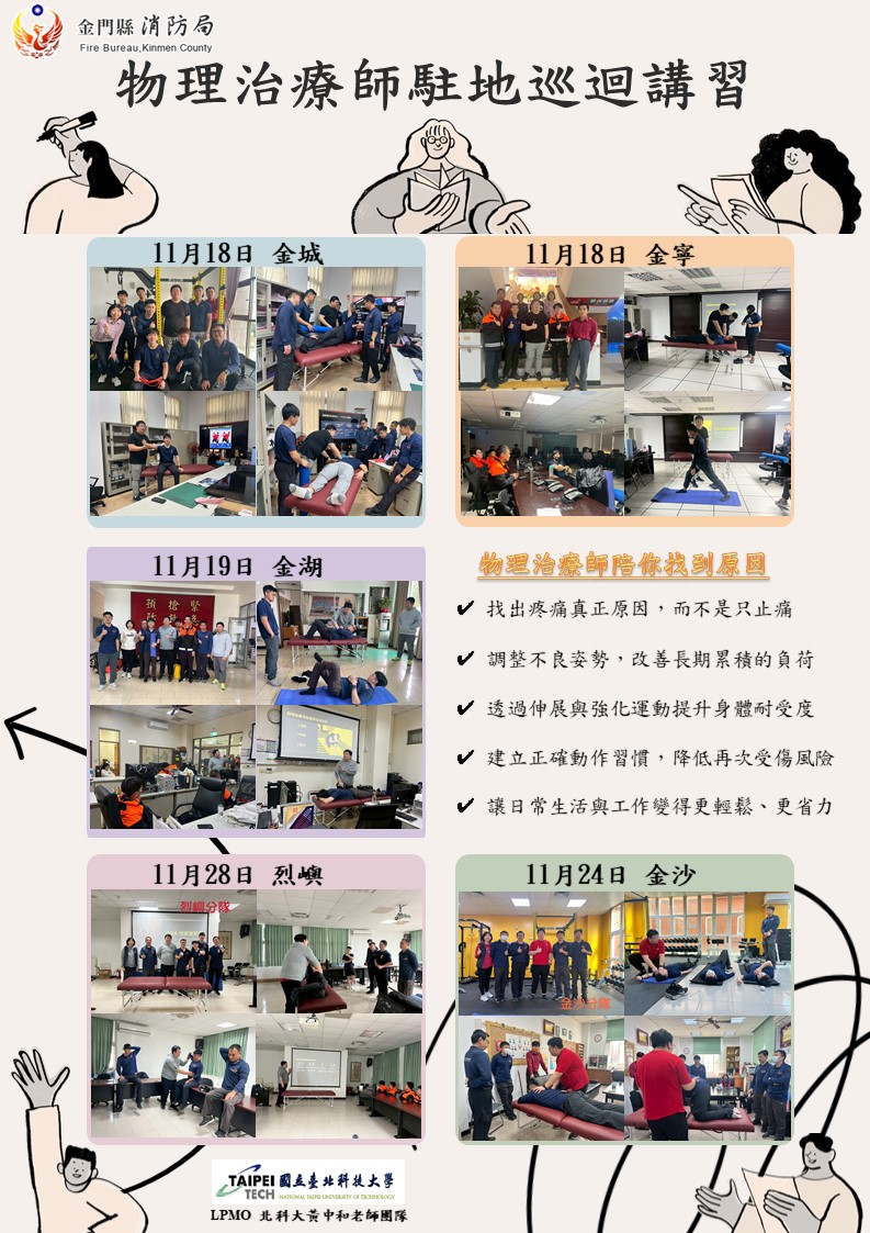為強化本局同仁執行救災救護勤務時之身體保健能力,降低長期累積之職業傷害風險,特於114年11月與國立臺北科技大學 LPMO 北科大黃中和老師團隊 合作,辦理「物理治療師駐地巡迴講習」。講習活動分別於金城、金寧、金湖、金沙及烈嶼等分隊辦理,由物理治療師直接進入分隊進行專業教學與實作示範。